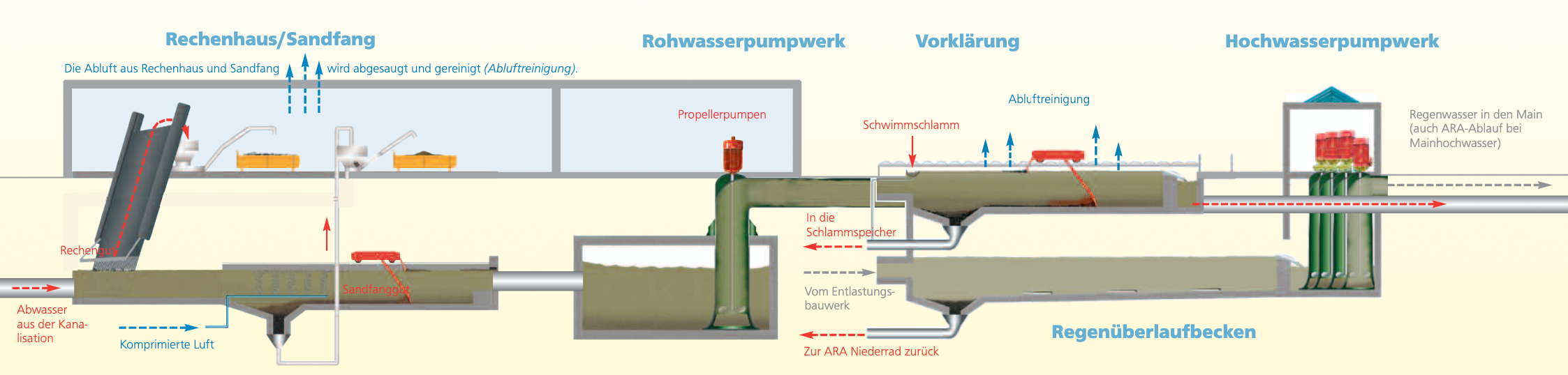 - Bei extremem Mainhochwasser kann das gereinigte Abwasser nicht mehr im freien Gefälle in den Main abfließen. Es wird deshalb mit Hochwasserpumpen über den Mainwasserspiegel angehoben.